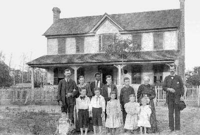 L-R back row: Moses Matthews Coleman, Martha Ann Yeomans (Mrs. M. M. Coleman), Ulyss (?), Wade Hampton, James Tillman, Martha O. Matthews Coleman (Granny), and Mr. Boatright (teacher).