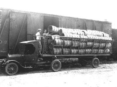 County Agent C. G. Garner (hat) looks on as a carload of sweet potato barrels is being unloaded.