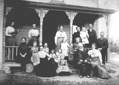 L-R back row on porch: Margaret McKercher (Mrs. Thomas Saylor); Aunt Neta's sister Lou Wallace; Margaret Jane Aitchison "Aunt Maggie" (Mrs. William Franklin Neal); Juanita Wallace "Aunt Neta" (Mrs. Thomas Bell Aitchison) holding daughter Marion on railing; Thomas Bell Aitchison; L-R middle: Jennie Aitchison; Donna McKercher; Agnes Y. Aitchison (Mrs. Peter McKercher); Emma Carolina Ritter "Aunt Carrie" (Mrs. James K. Aitchison); Mildred Aitchison; Mabel Irene Aitchison; Edna Neal; Gail Woodham; Jennie Woodham. L-R front: Elizabeth Hall Woodham "Bunty"; Grandfather James Aitchison; Isabella Sophia Aitchison "Aunt Belle" (Mrs. Reuben George Woodham); James K. Aitchison "Uncle Jim".